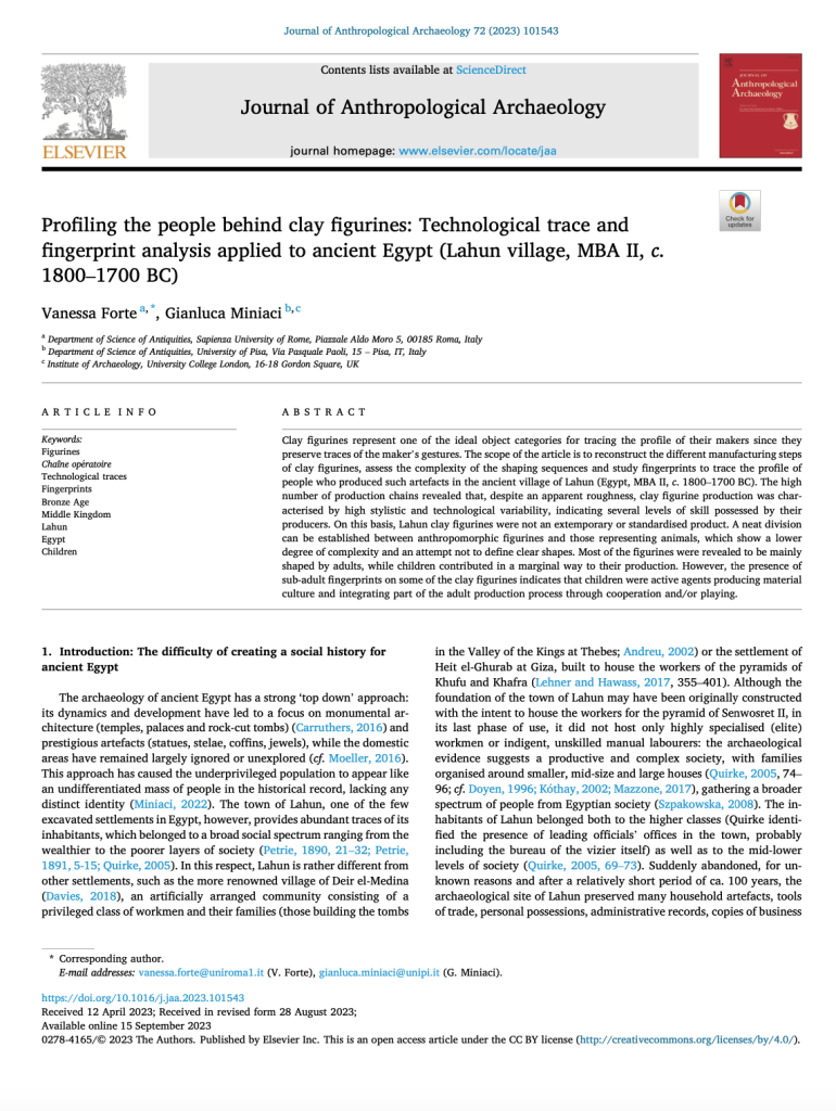 Miniaci G., Forte V., Grajeski W., Saler C. 2022. Mud Figurines from Lahun: searching for an “archaeometric” social history. Egyptian Archaeology, 60:19-20.